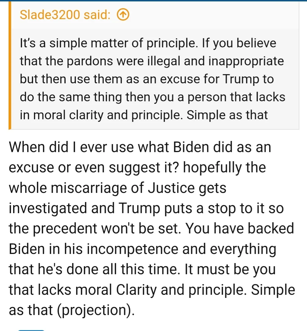 I haven’t deflected anything. I just said Biden’s preemptive pardons were wrong and it would be wrong if Trump does it as well which I predict he will do.You once again, seem to be deflecting, Trump has done no such thing. He could have, but has no need to do it. You keep projecting, to deflect from what has actually happened.