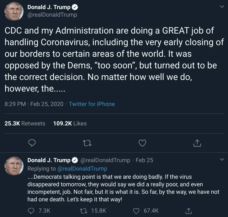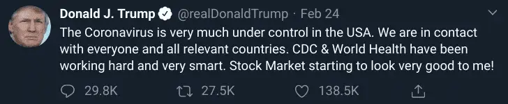 Feb. 24: “The Coronavirus is very much under control in the USA… Stock Market starting to look very good to me!”