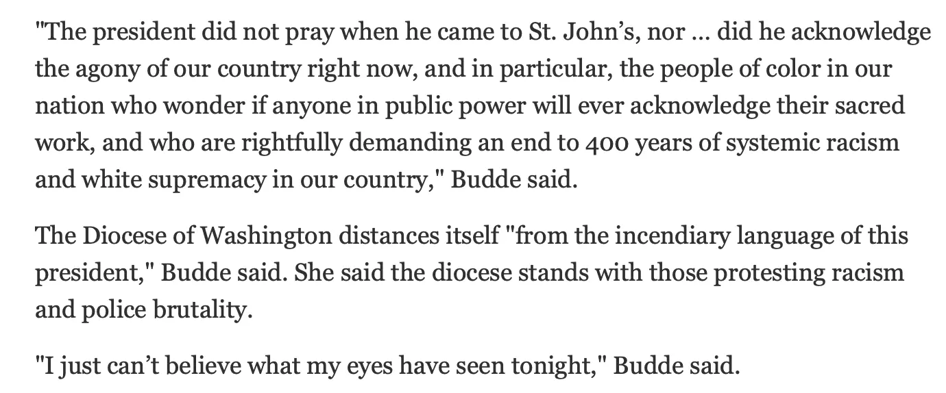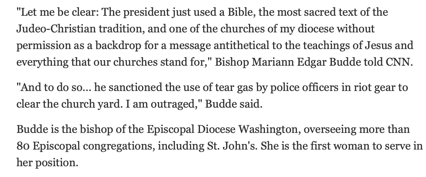 DC Episcopal Bishop Mariann Edgar Budde said Trump used his visit to St. John's Church for a "message antithetical to the teachings of Jesus."