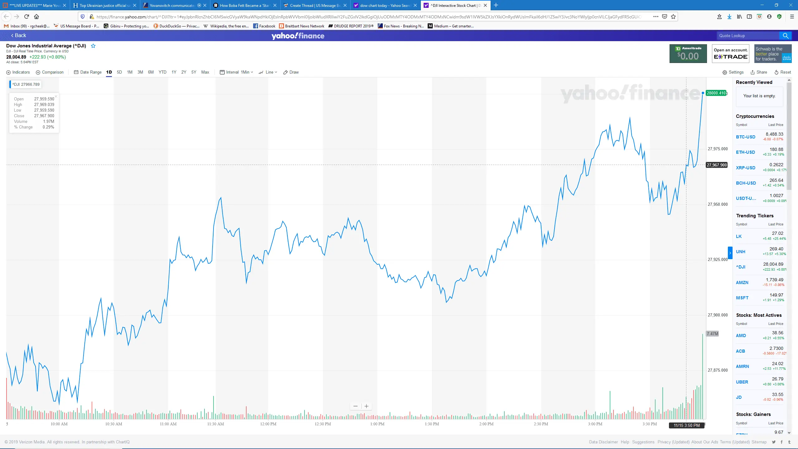 JimBowie1958 Old Fogey Joined Sep 25, 2011 Messages 63,590 Reaction score 16,898 Points 2,220 Nov 15, 2019 #1 28,000 of them in fact. Dow breaks 28,000 with big boost from one company
