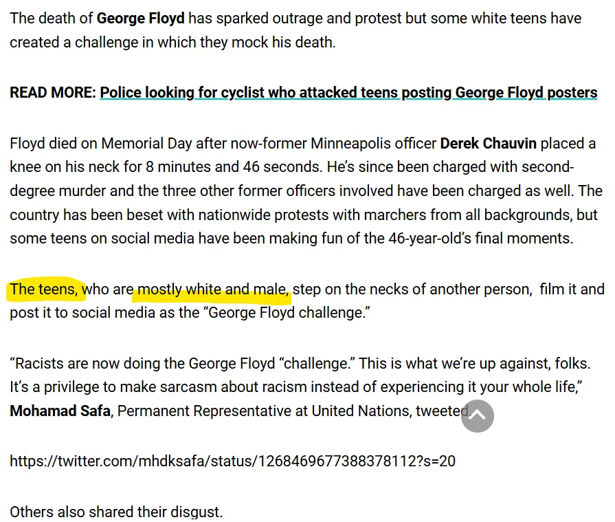 No matter which side it comes from wrong is wrong.There's this saying, a picture is worth a thousand words. Did you complain about the "George Floyd Challenge" which involved openly mocking his death at the hands of former law enforcementofficerChauvin?
