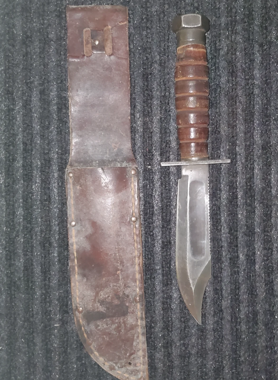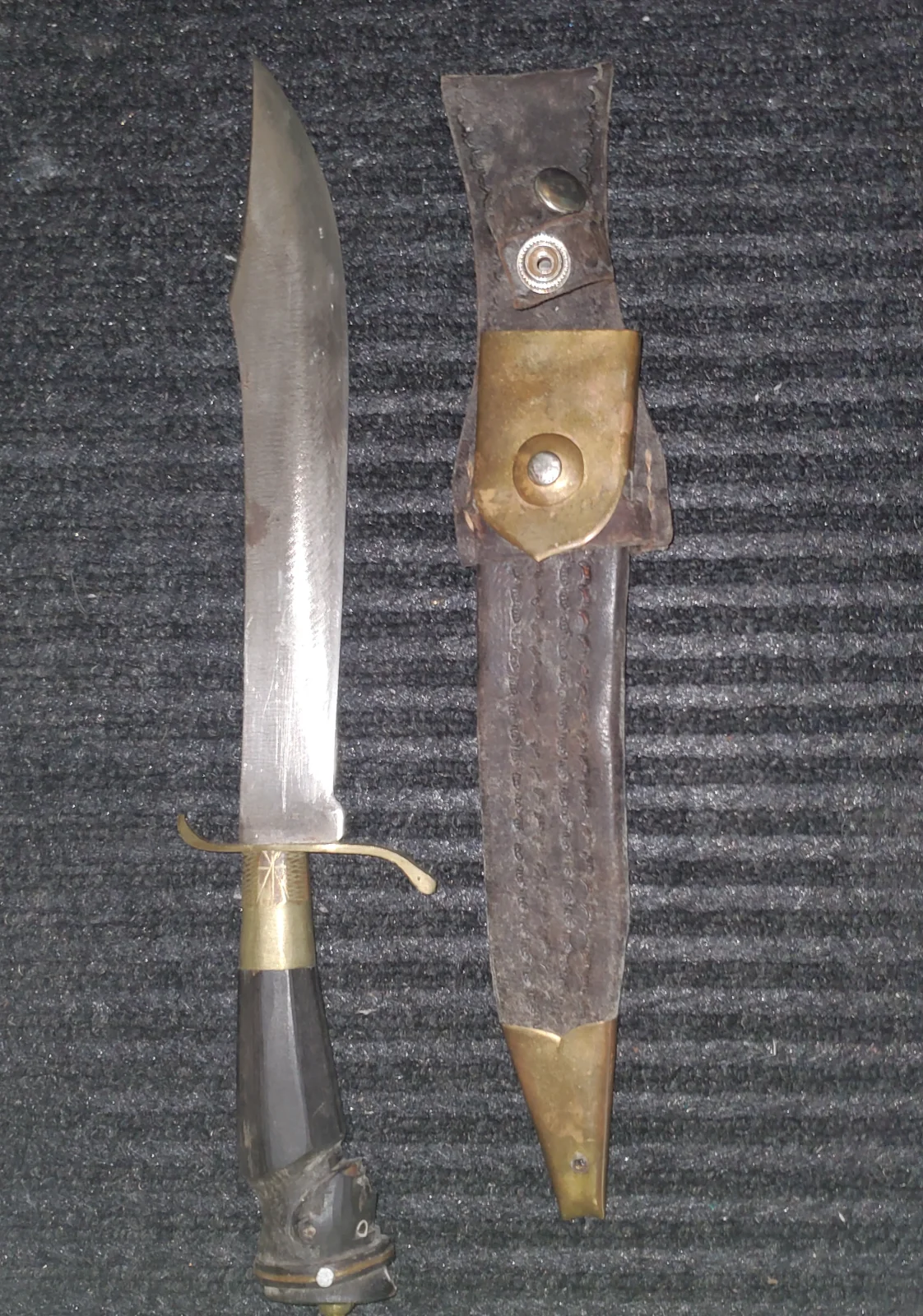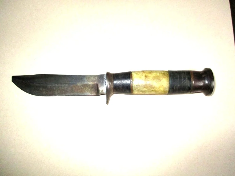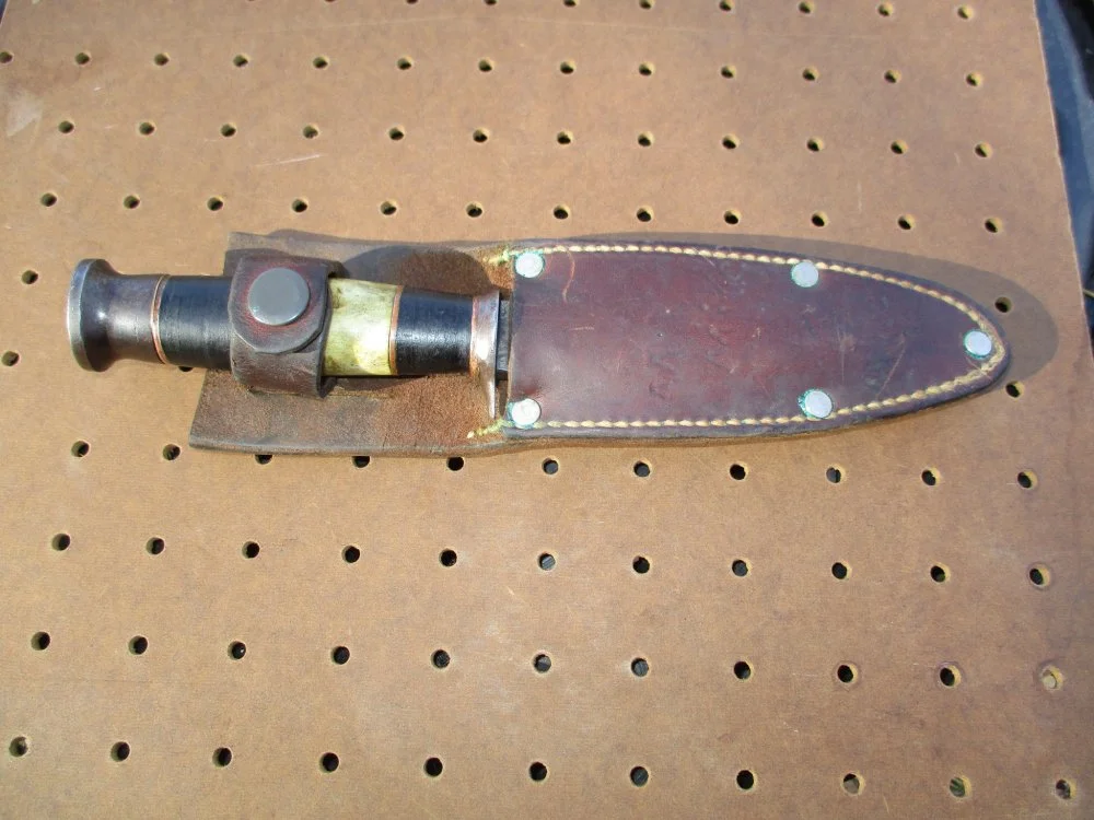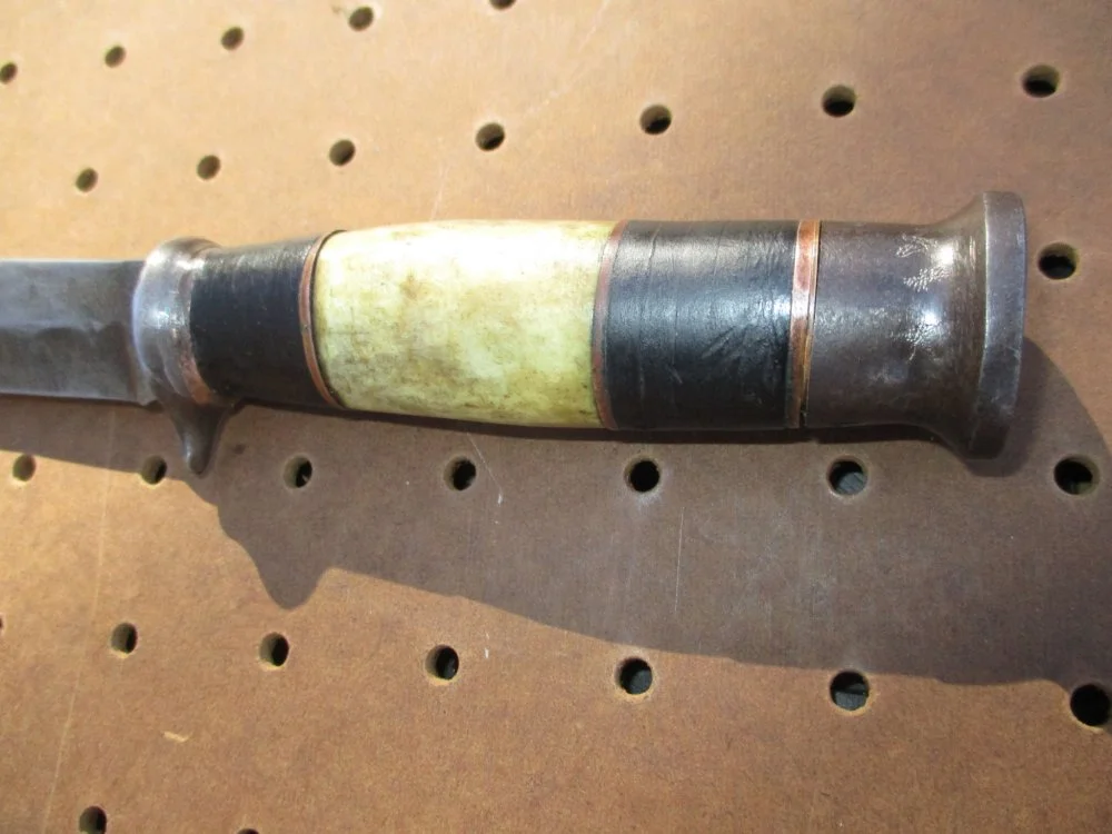 Rummaging through Goodwill last week I came across three old fixed blade knives for $3.99 apiece. Two of them were a 4-1/4" and a 3" bladed Western Cutlery of Boulder, Colorado with the leather sheaths. They're not particularly unusual, worth only $30 - $50 on Ebay. The third one was an 8-1/4" long custom-made fixed blade knife with a heavy carbon steel 4-1/4" blade. It has a leather and brass washer handle on the tang with a piece of genuine bone on the handle. The knife has no manufacturer's or maker's markings on it, and AI couldn't identify it.