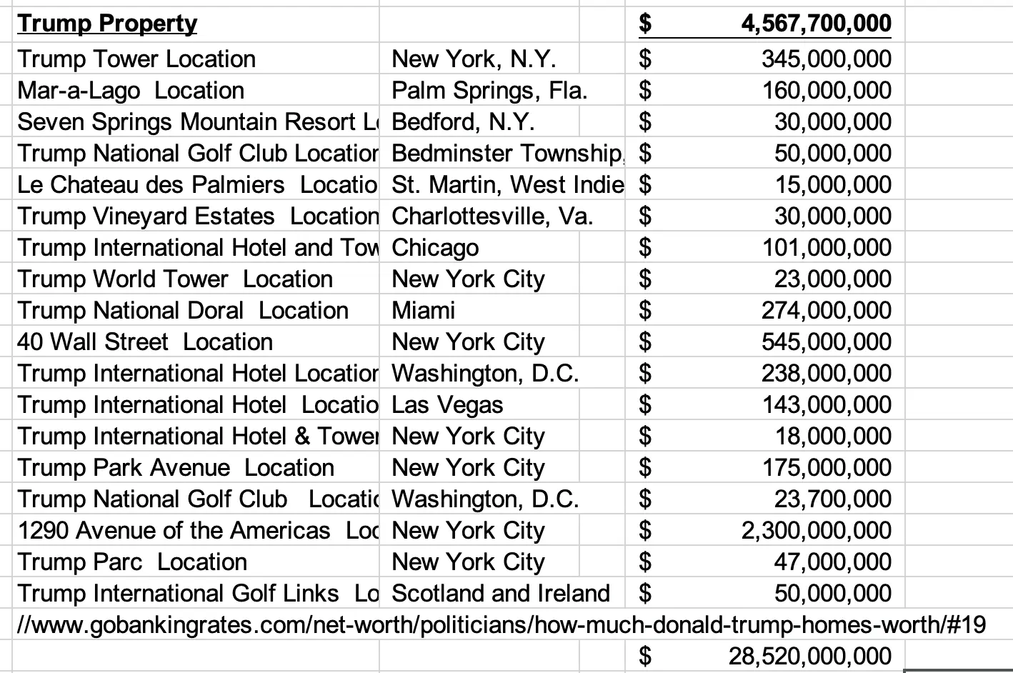 You're delusional. Every one of those properties are either mortgaged to the hilt or are just bearing his name. And for you to believe the valuations stated here, proves beyond a shadow of any doubt that you are indeed a Trump Sheep. The supposed values of every single one on that list are cooked up for justifying loans and they will never appear on a tax return because he devalues all of that nonsense to avoid taxes. Just look at how much he paid in taxes over the last ten years when they become public. 5 years have already shown he paid next to nothing. Shit! Even he doesn't claim that kind of wealth. My best guess based on others who have looked into it is that his net worth is under 300 Million. And now that the Russia sanctions are imposed and the almost total devaluation of the Ruble, Russia has no money to pay him for all of the suites and offices that they have bought. So, he'll soon be hurtin' for certin'! And that's not even counting the civil torts and other suits and legal fees he faces.