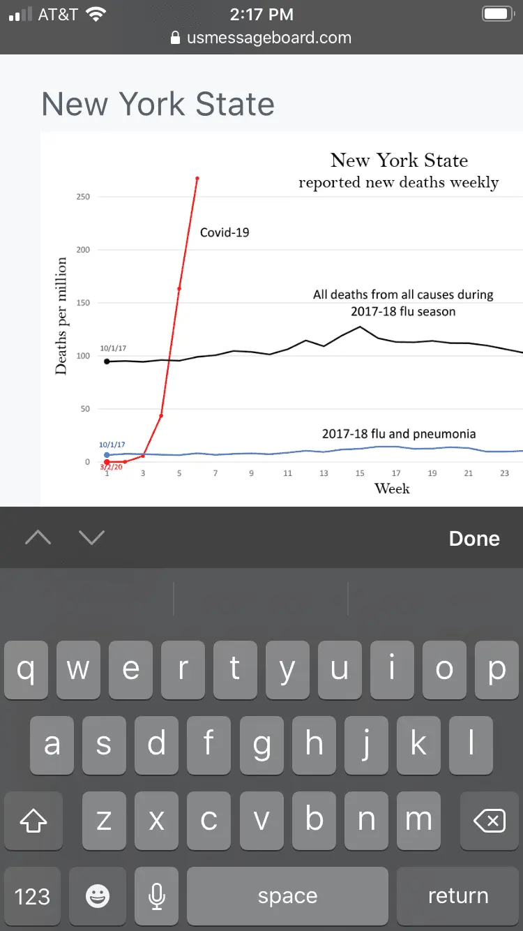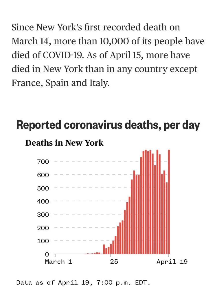 Note the markedly larger scale of deaths per million on the New York chart as compared to the United States — indicating how much harder Covid-19 has hit that state than the country as a whole.