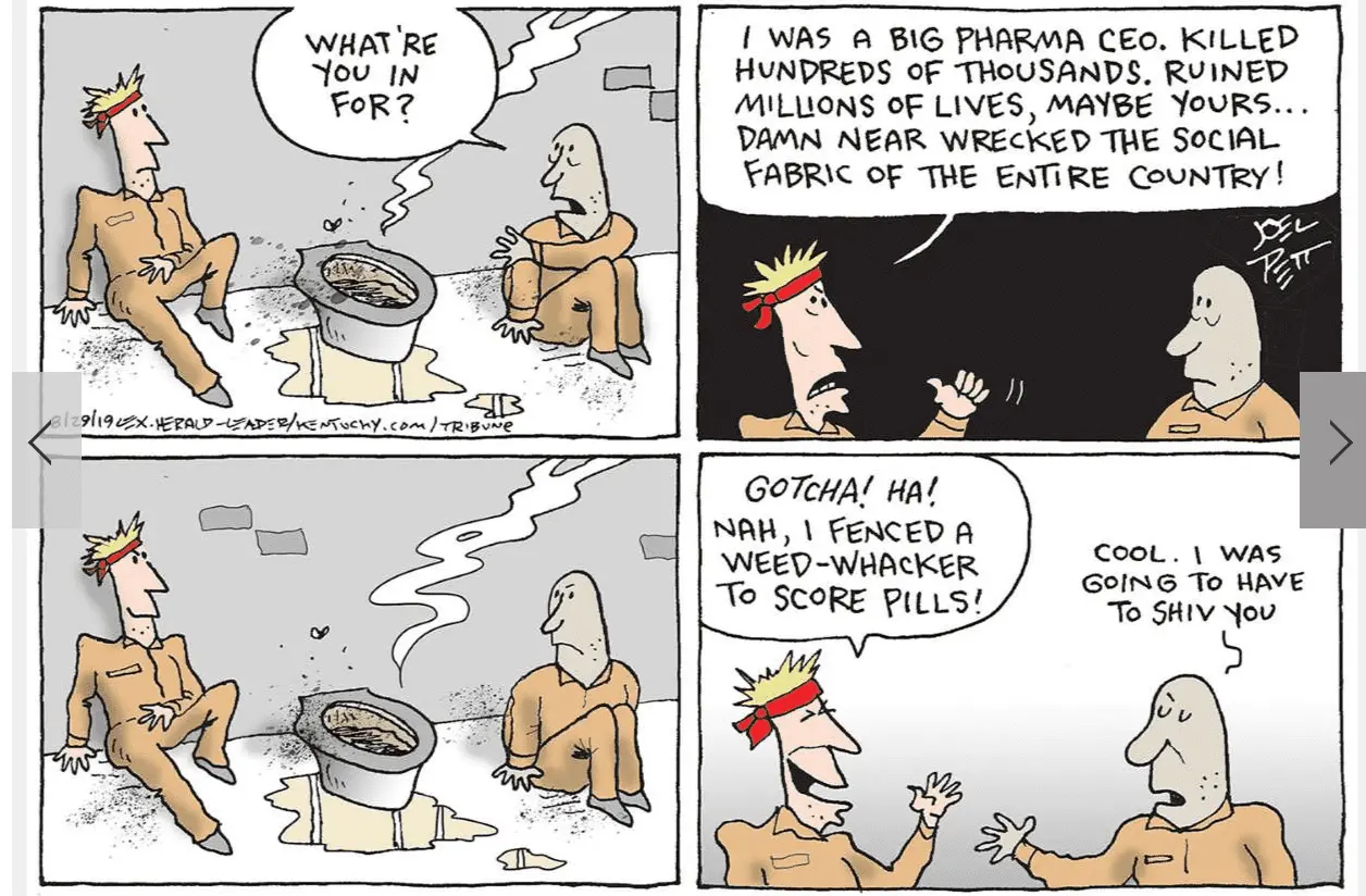 That's wrong. They knew what their drugs did to people yet they bought politicians anyway, yet they shipped those drugs to pharmacies they knew were selling those drugs to anyone using any type of prescription and they knew it was wrong. Making it no longer illegal doesn't all of a sudden make it right.