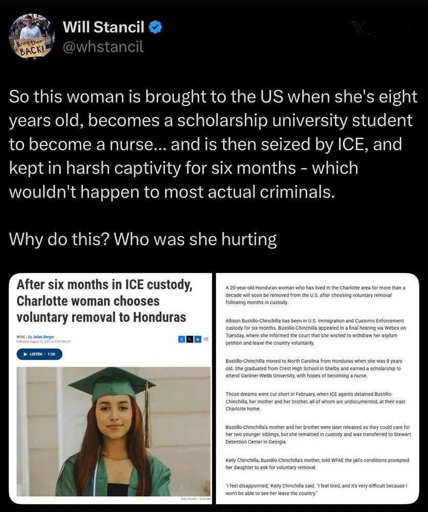 The ICE organization continues to roll through this country and make us all safer. I am not sure how high the criminal element is in female honor roll nursing school students with scholarships to college who have been in the US since they were 8 but I suspect it is really really high. As a Charlotte resident I am feeling safe already.