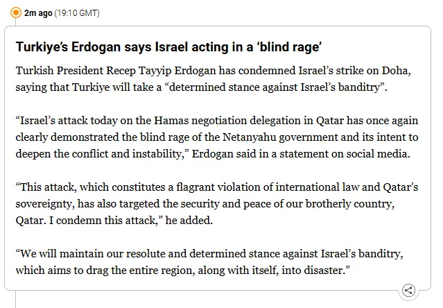 In an attempt to assassinate Hamas officials and blow up the latest proposal to end the genocide in Gaza, Israel conducted an air strike on Tuesday 1000 miles from the Green Line: