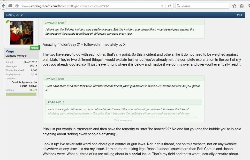 on exactly this issue (I signed up here directly between Bob Costas and Sandy Hook). I have spelled that out over and over that it's gun