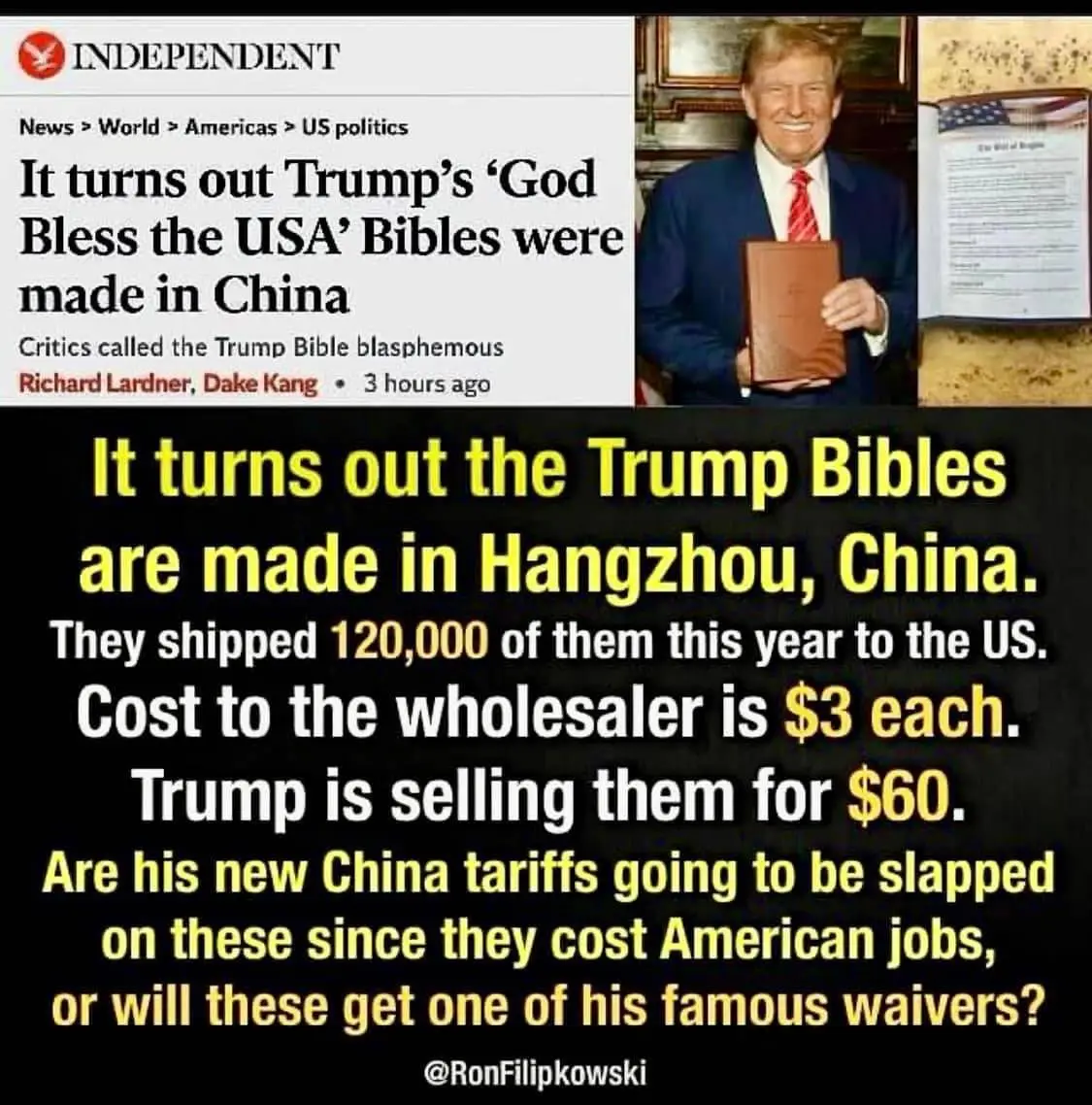Trump buys his Chinese manufactured Bibles for $3 and sales them for $60. The profits do not go to a political campaign or a charity. The profits go to the Donald Trump revocable Trust..
