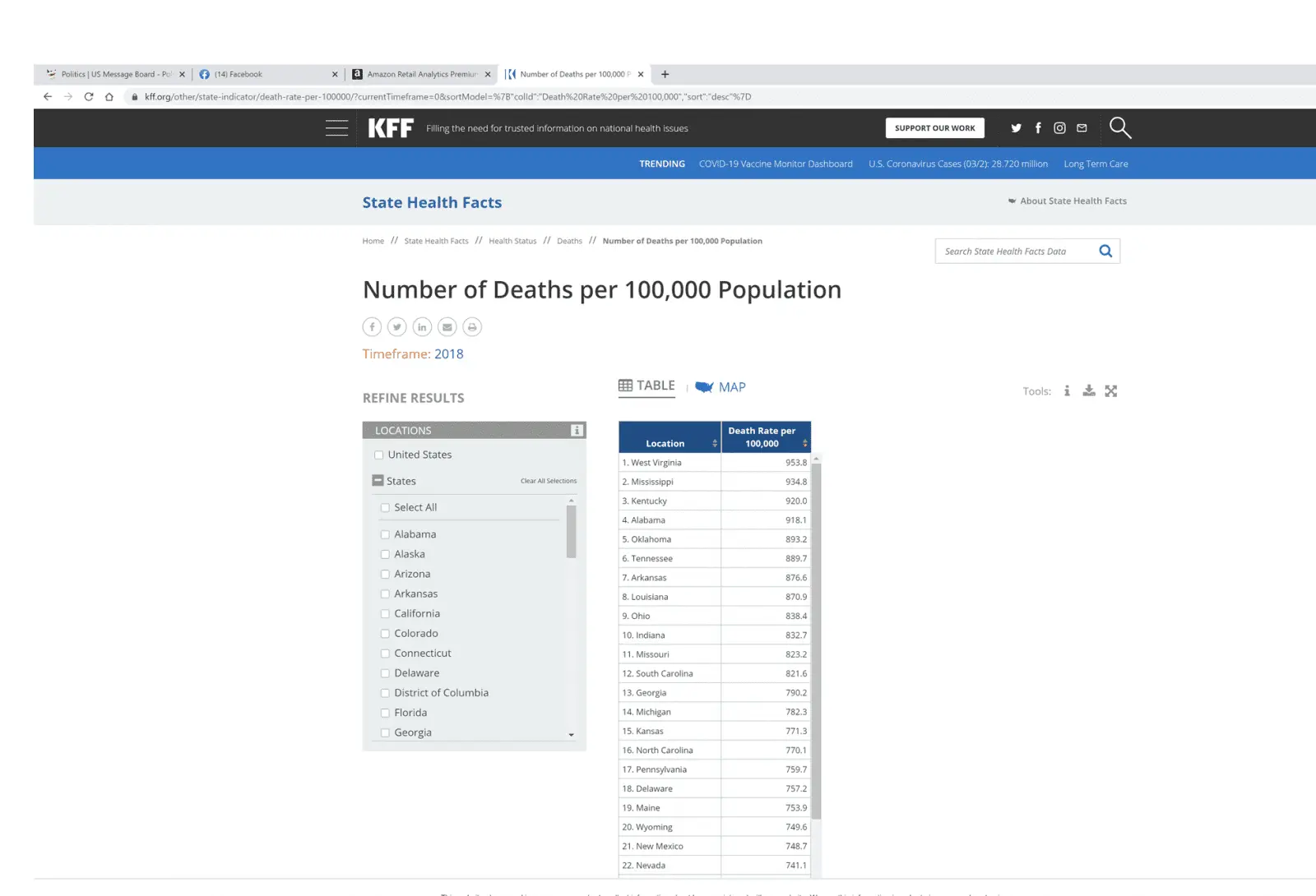 State level data on Total Deaths and Death Rates per 100,000 Population from KFF, the leading health policy organization in the U.S.www.kff.org