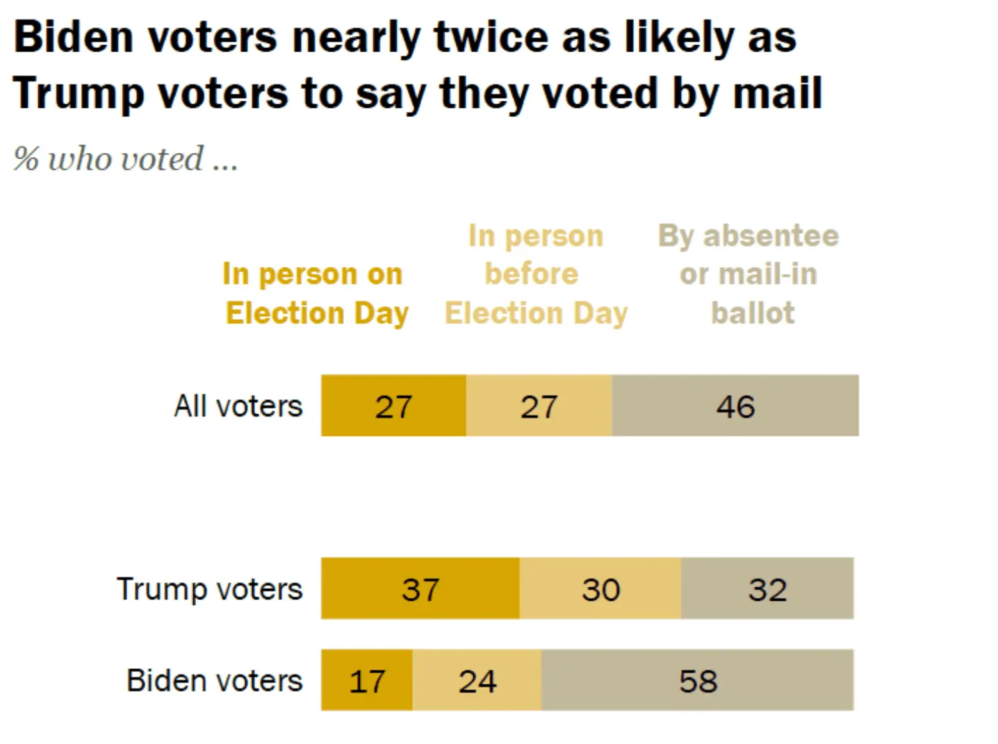 A slim majority of voters (54%) say they voted in person this November, compared with 46% who voted by absentee or mail-in ballot. About one-quarter (27%) report having voted in person on Election Day, and an identical share say they voted in person before Election Day. Two-thirds of Trump...
