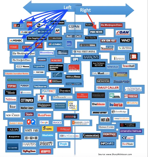 And of this chart, there are TWICE the number of left leaning media. Of the right leaning, you have Fox of course, but it is only middle right. Of the others listed on the right, there is hardly one other widely known or well read/watched source. Most of those listed are minor cult niche media outlets.