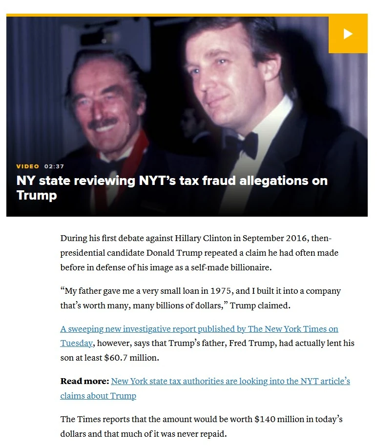 A sweeping new investigative report published by The New York Times on Tuesday, however, says that Trump’s father, Fred Trump, had actually lent his son at least $60.7 million.