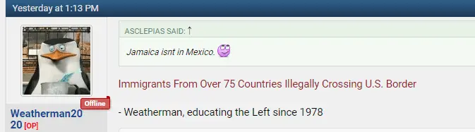 This is the kind of dumb questions and comments I get from people that havent been around Mexicans. There are a lot of Mexicans that look Asian. Lets say for a moment that Mexicans dont resemble Asians. Who are you going to see first trying to sneak over a Mexican border? A Black person or an Asian person?California is closer to China but we are getting Chinese crossing from Mexico because the boarder is a sieve and since when do Chinese look Mexican.What does Chinese coming through Mexico have to do with the fact that Florida is much closer to Jamaica and Jamaicans wont stick out like a sore thumb coming in via Mexico?Chinese travel to Mexico to cross the boarder. Jamaica is a lot closer.Moron thinks Jamaicans travel to Mexico to enter the US.Dufus thinks only Mexicans cross the border.![]()