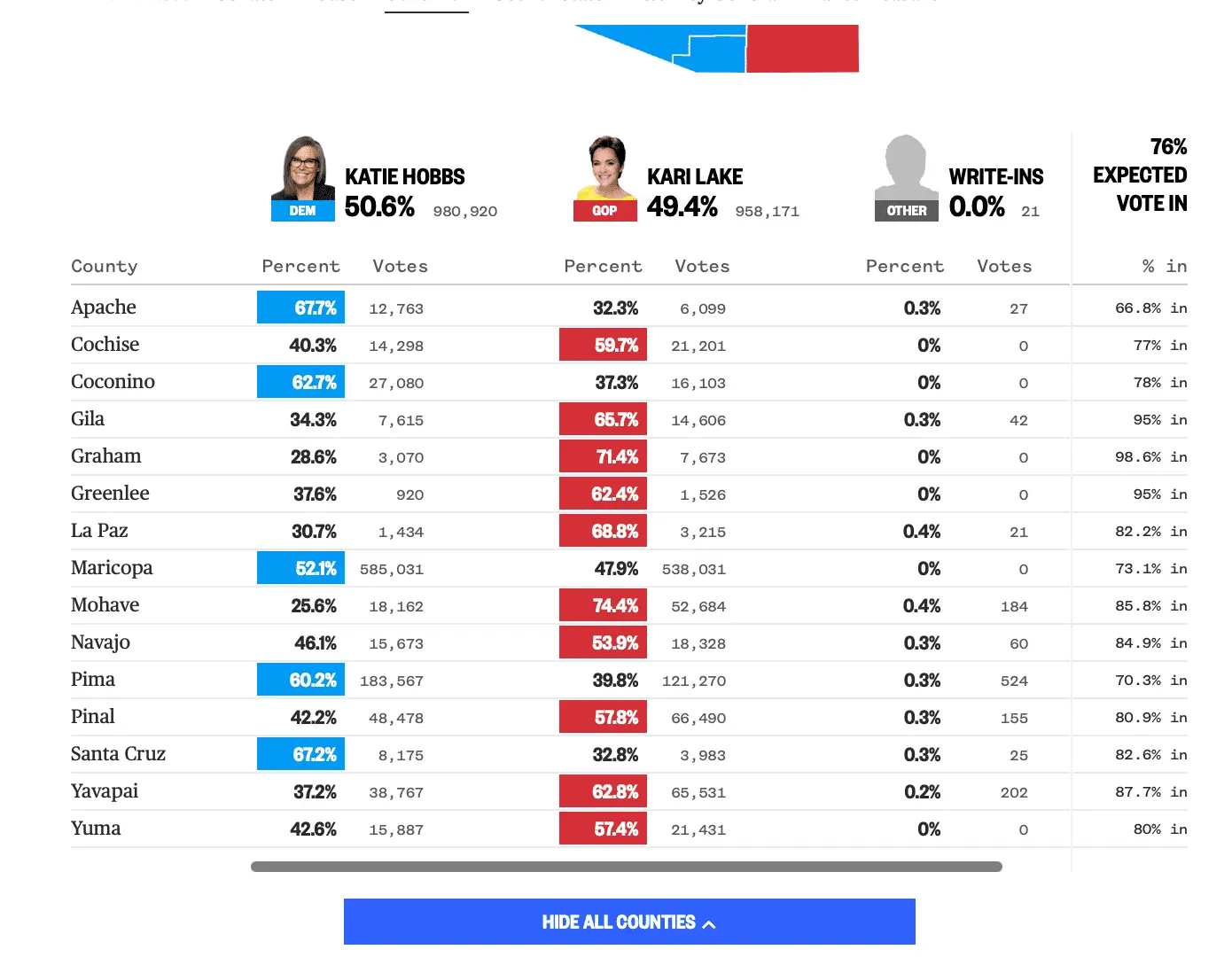 Hobbs is leading in those counties, and the remaining votes will probably be similar to the current results.