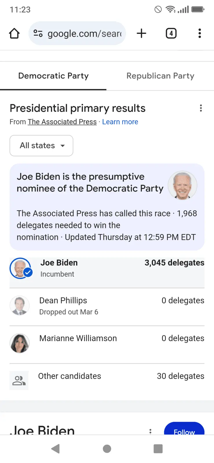 I was just looking at the overall results from the primaries. There is absolutely no legit reason for it but it appears that Biden is ahead.
