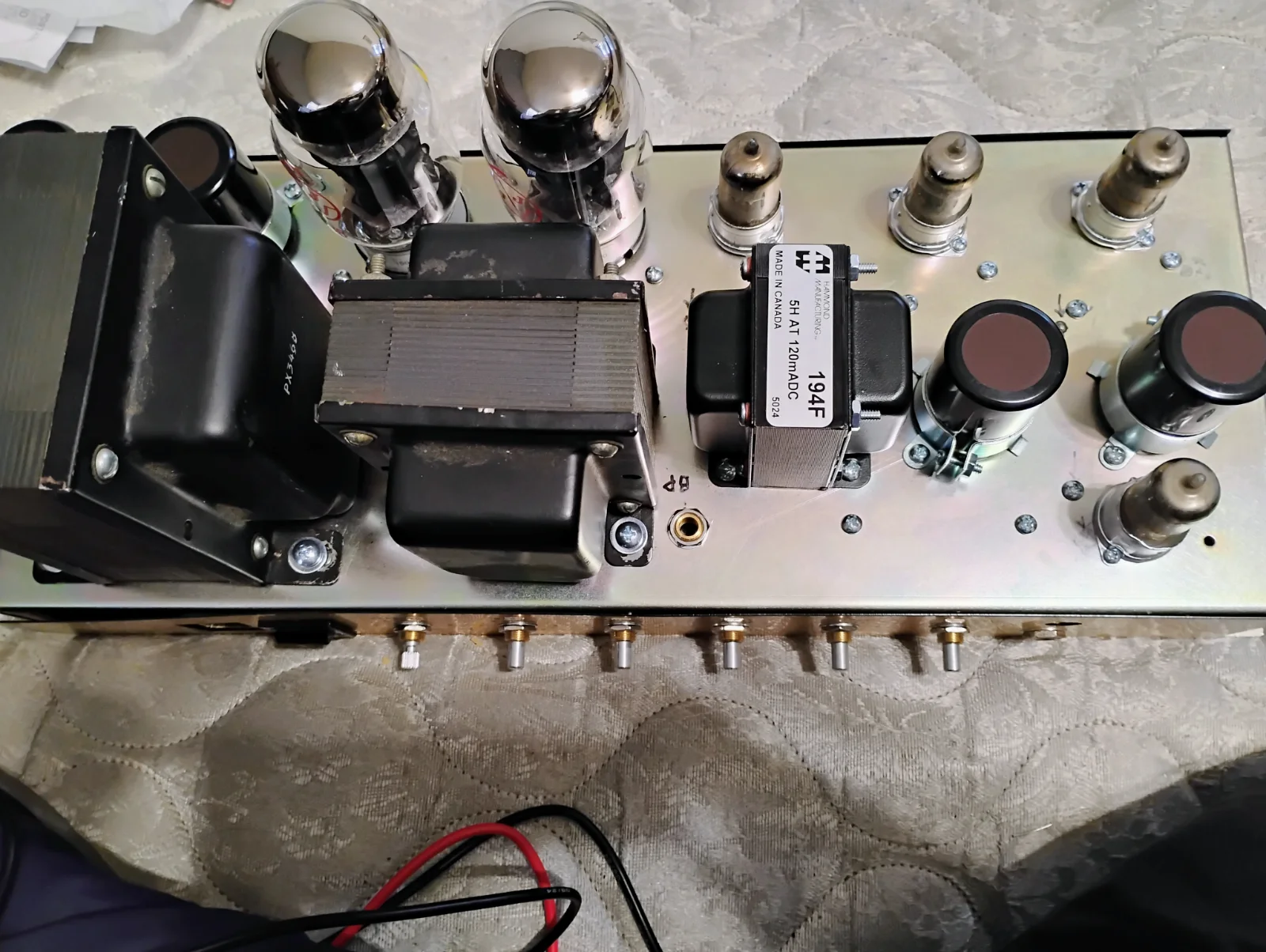 So far so good, next step is to turn on the standby switch and see if we have juice on the other side of the choke. And, build out the bias circuit. Then pop the big tubes in there and see if they behave. The fuses should arrive Monday, and the switch on Tuesday.