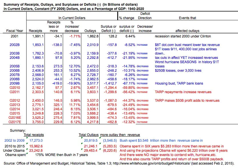 First of all Bush's first fiscal year was 2002 not 2003 on your chart, and including estimates for 2016 and 2017 does not make 6 years for Obama. So the lying scum use 7 years for Bush as 8 years and 8 years for Obama as 6 years.