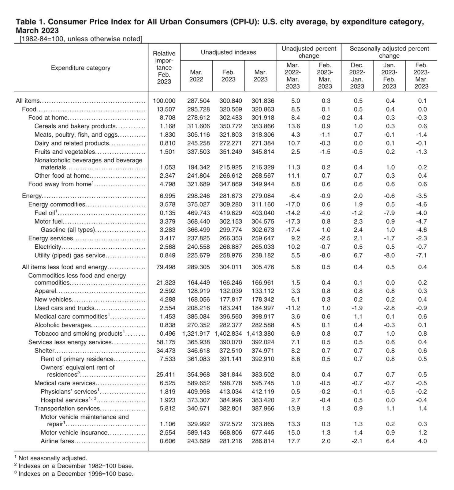 Inflation rises just 0.1% in March and 5% from a year ago as Inflation Reduction Act takes hold. Food and Gas offset each other to be flat and everything else looked good with the lone except being housing. Housing is a double edged sword as appreciation creates wealth.