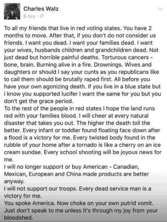 However, one internet threat caught many’s eye and started a man-hunt of sorts. Charles Walz from New York posted this disgusting status on Nov 9, but when he was confronted by the masses of angry citizens, seems to have fallen off the face of the planet."