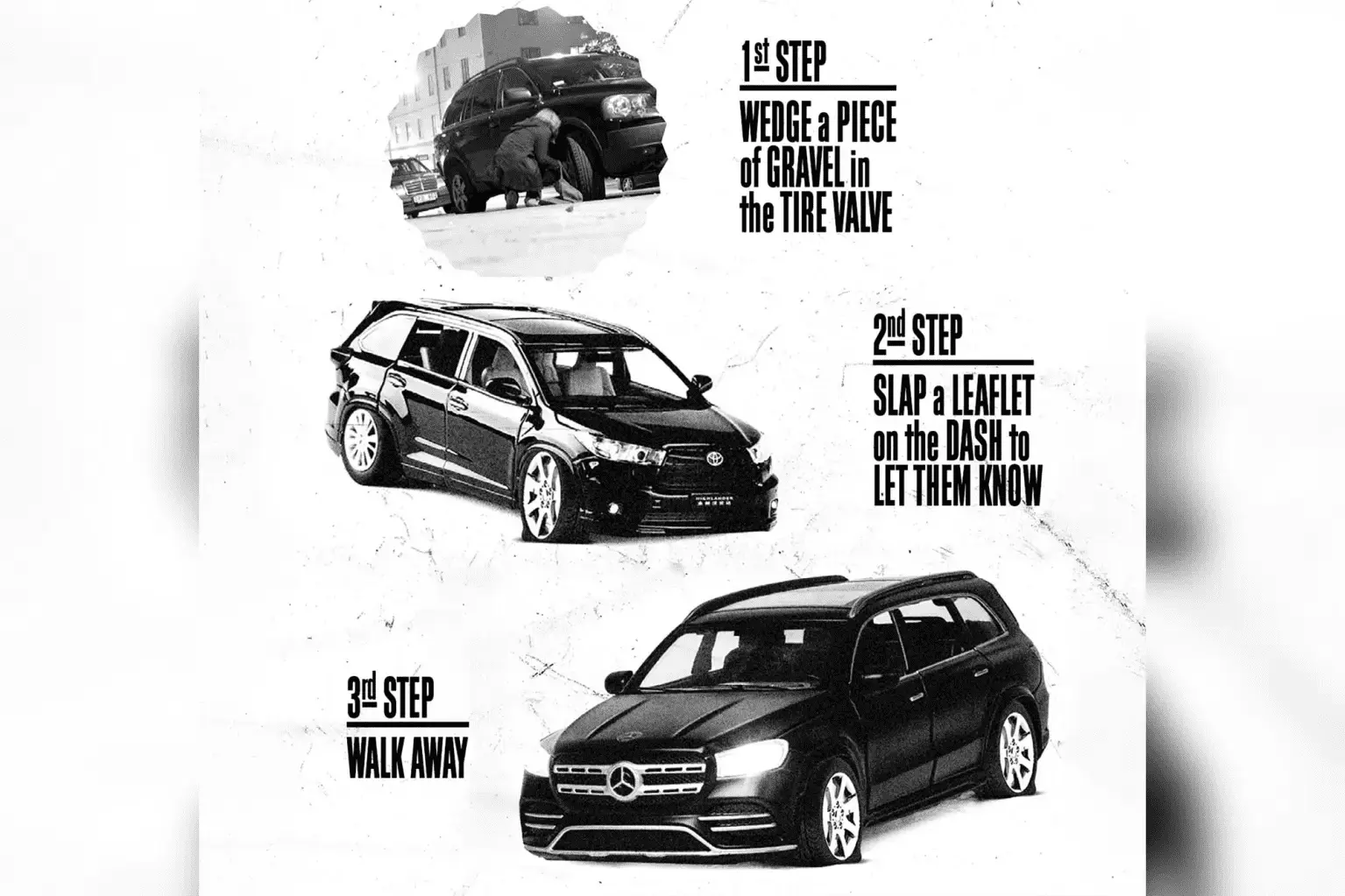 “Wedge gravel in the tire valves, leaflet the SUV to let them know the tires are flat and why it was done, and walk away. It’s that simple,” the group said in a tweet.