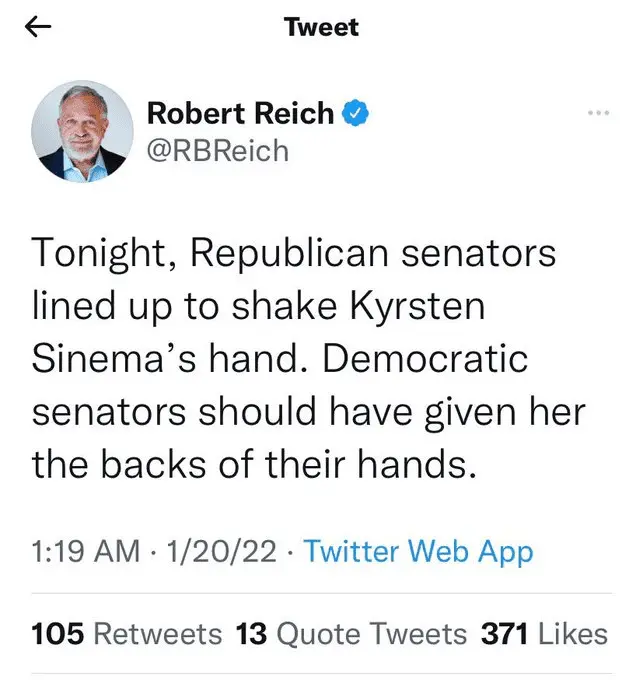 That is how the Cult treats their apostatesThe aptly named Robert "Third" Reich tweeted his desire for Senator Kyrsten Sinema to be physically assaulted for not voting the way he wanted her to vote.