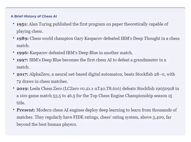 Chess playing software emerged out of artificial intelligence research in the 1960s, it is a prime example of AI.