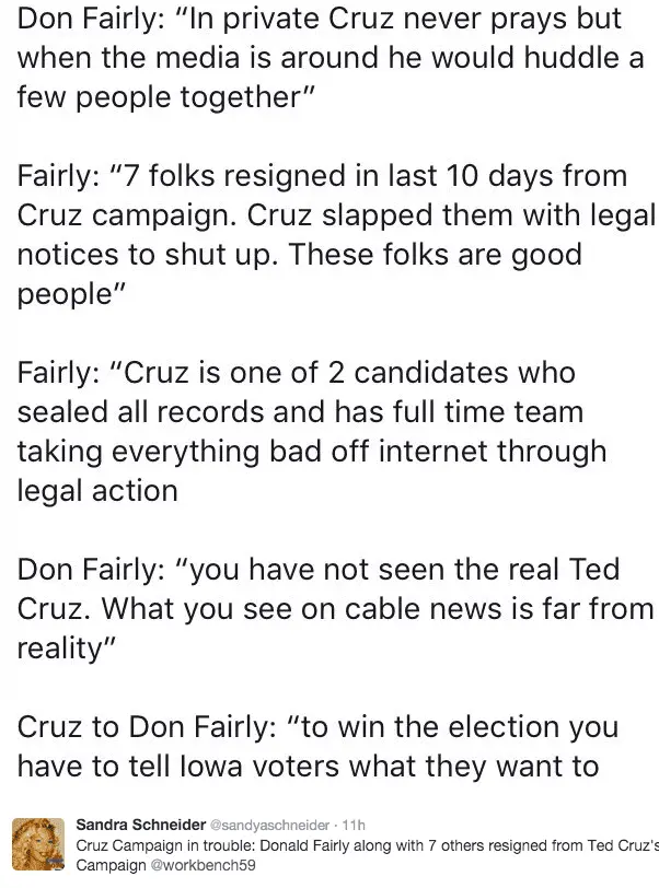Cruz's campaign is falling apart at the seams...he lost 7 people along with Fairly. You can smell the defeatCruz by a nose. Sanders by a nose...Trump in a landslide?..Please