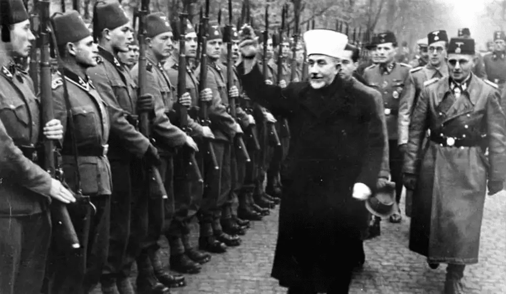 Haj Amin al-Husseini, the Grand Mufti of Jerusalem, greeting Muslim Waffen-SS volunteers with a Nazi salute, November 1943. Credit: Bundesarchiv / Wikimedia Commons