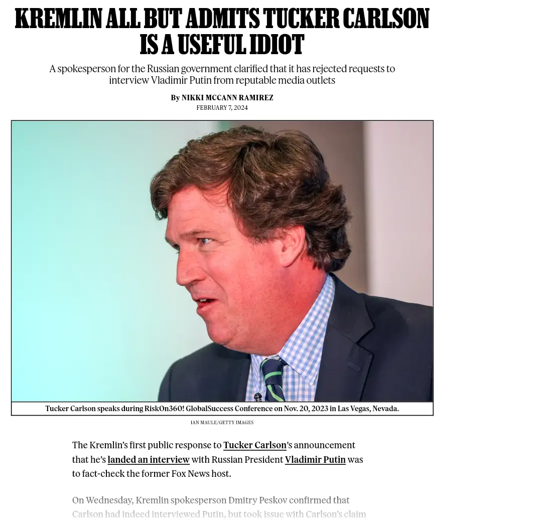 so you follow the guy providing kremlin news, commiee guySorry you didn't even see the link. It's from Rollingstone reporter, not Kremlin. Reporting about Tucker propagating for Putin while Kremlin laughs at him,sees him as useful idiot.
