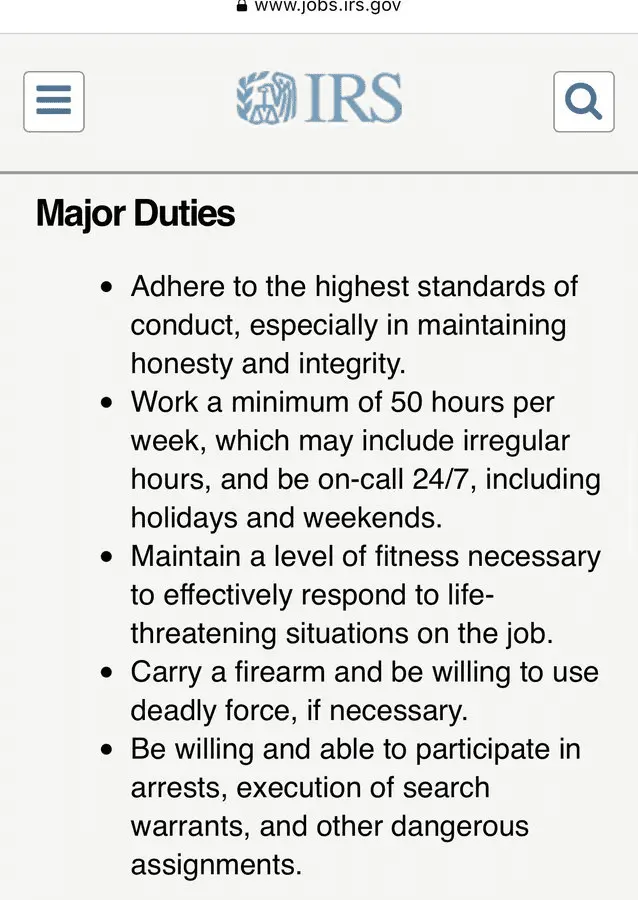Requirements include working min “50 hours per week, which may include irregular hours, and be on-call 24/7, including holidays and weekends” and “Carry a firearm and be willing to use deadly force, if necessary.”