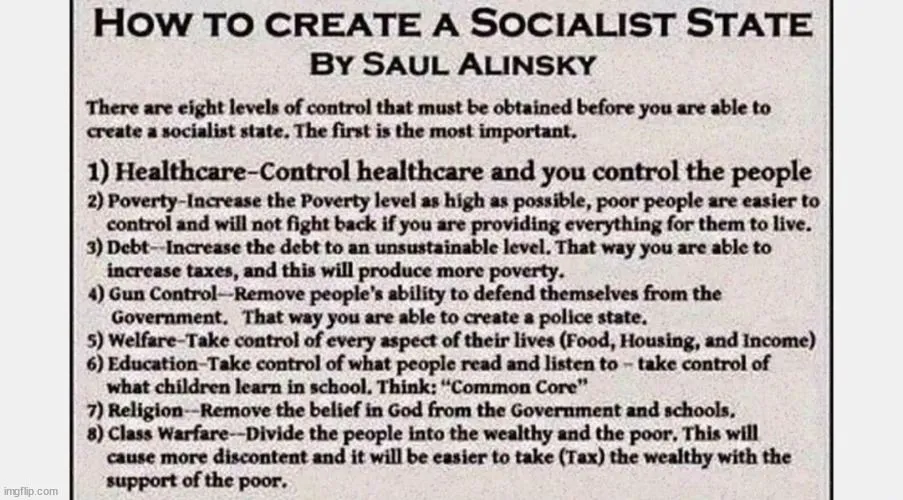8) Class Warfare — Divide the people into the wealthy and the poor. This will cause more discontent and it will be easier to take (Tax) the wealthy with the support of the poor.