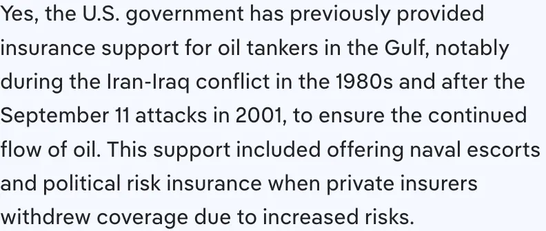 It goes without saying now that trump has done it devoted trump enthusiasts will agree it is perfectly fine. In reality its another instance where the trump government is involving itself in what used to be the purview of the private sector. Reinsurance companies exist in the free market. They help first tranche insurance companies lay off the risk of massive losses. If private sector reinsurance companies saw a favorable risk/reward scenario in insuring ships passing through the Straight of Hormuz they'd be willing to write policies to that effect. They aren't.