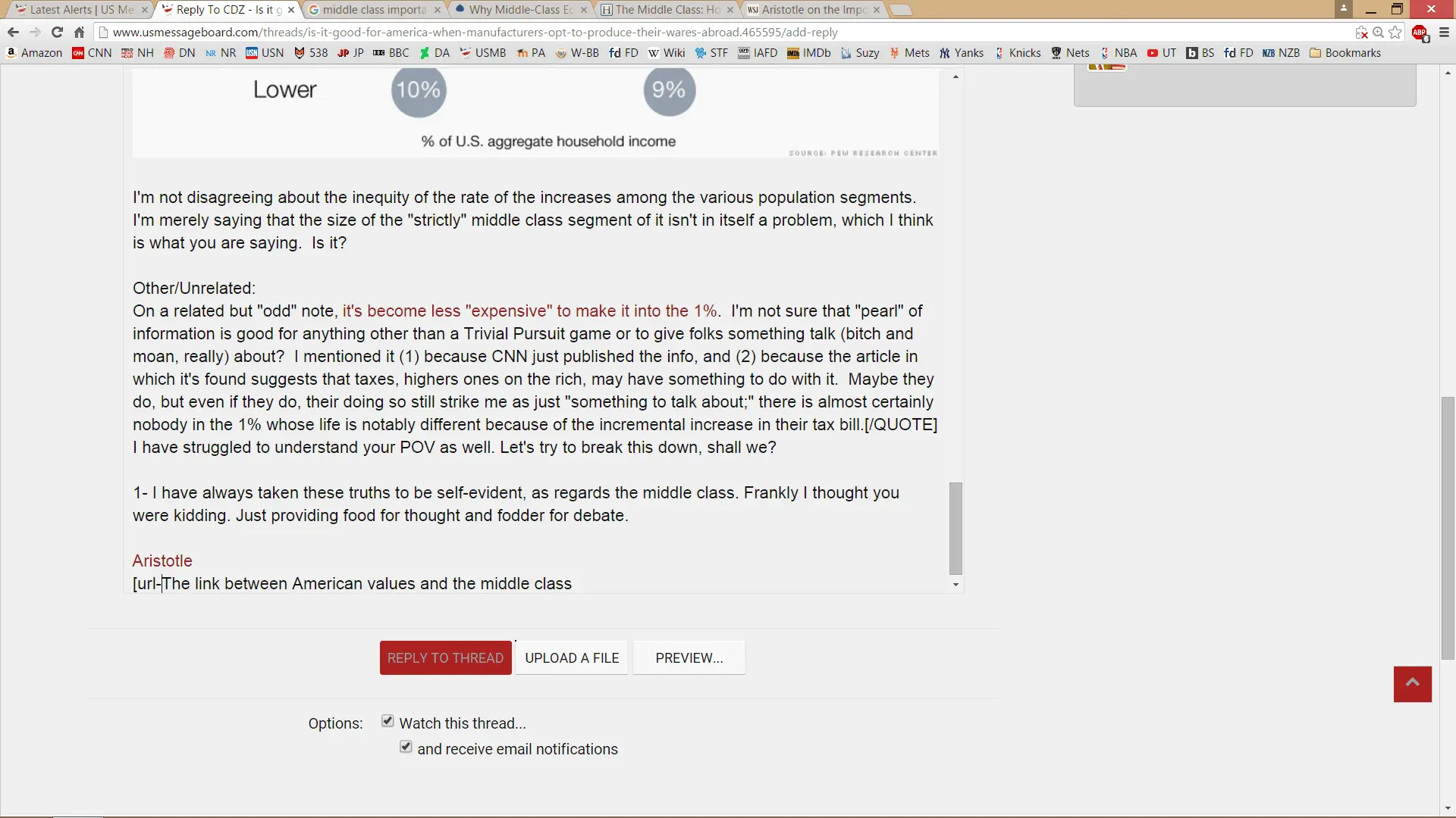 I am still trying to make sense of these comments. Specifically, I don't see how it indicates that there is something wrong with the middle class population being smaller as a result of formerly middle class folks moving into the upper middle class (as stated in the NYT article cited earlier). Were it a matter of the middle class population being smaller because they were moving from being middle class to being lower class, I'd think there's something going wrong, really wrong.