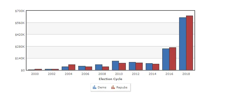Amazon gives almost equally to both parties...
