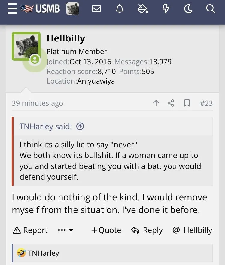 Sounds like it, thats why you ran. Hope you had your tennis moccasins on, big manShe was about half my size. She couldn't do any more damage than you could. Nevertheless I can say I have never hit a woman and I never will.
