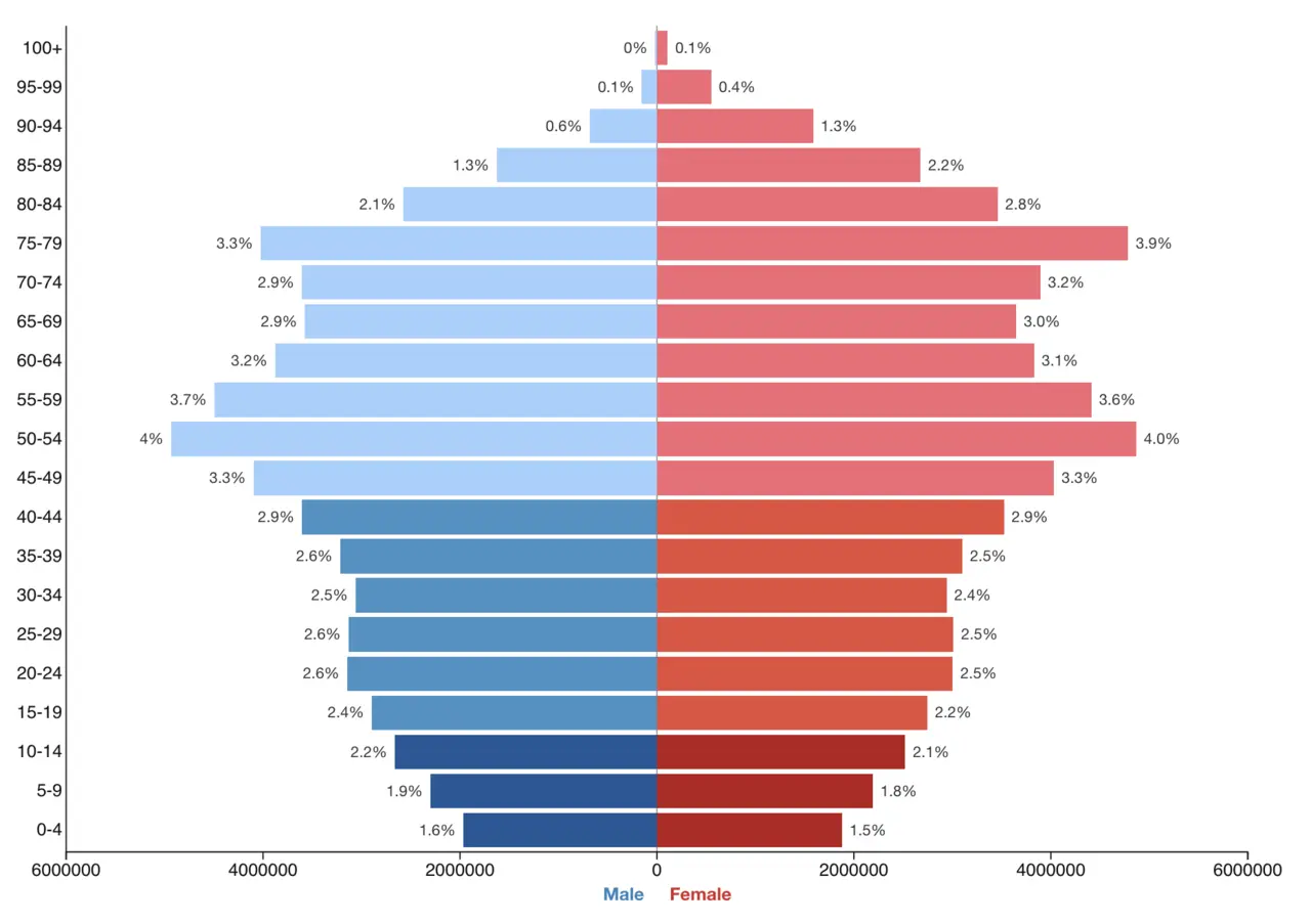 Japan has a pretty similar demographic situation. But it has less younger people because of their lack of immigration.