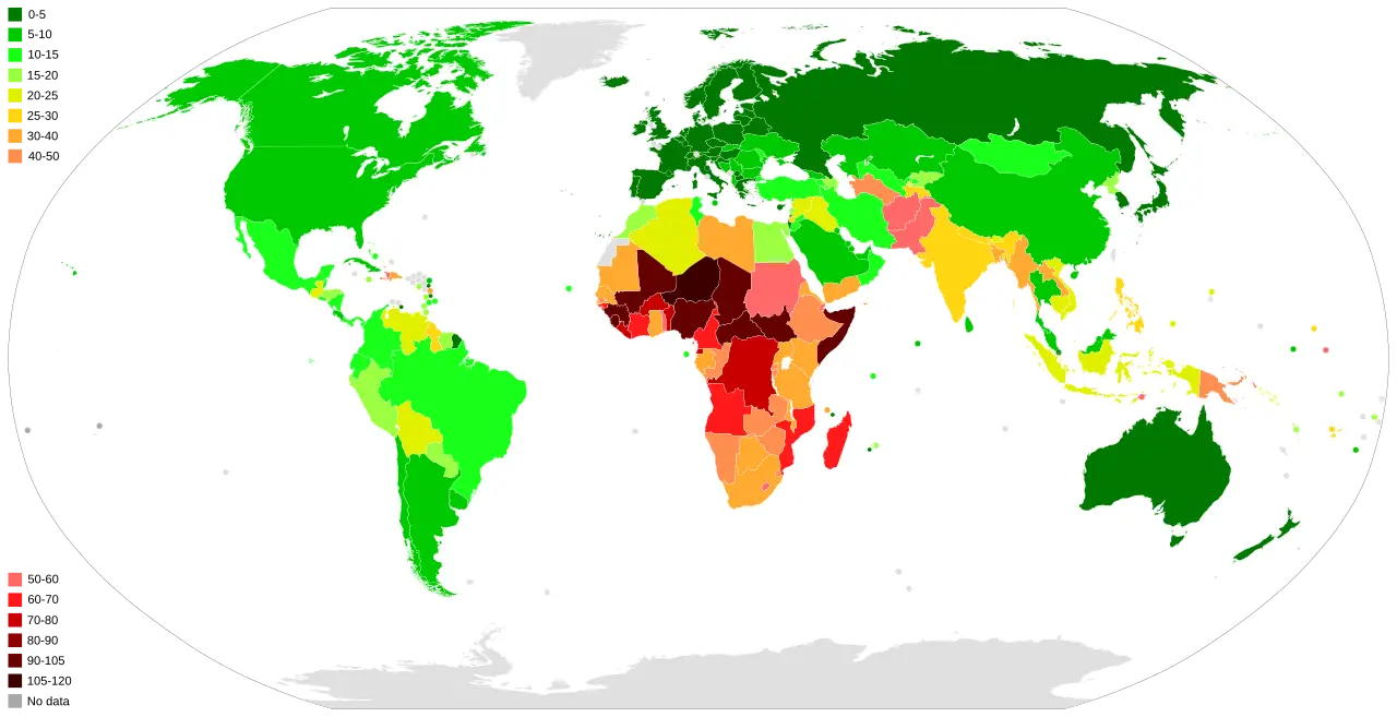 And here's a map of infant mortality. Which is probably pretty similar to fertility rates. Because if your kid is 10 times more likely to die before the age of 5, you're more likely to have kids. If needed people to look after you when you're old, you're more likely to have more kids.
