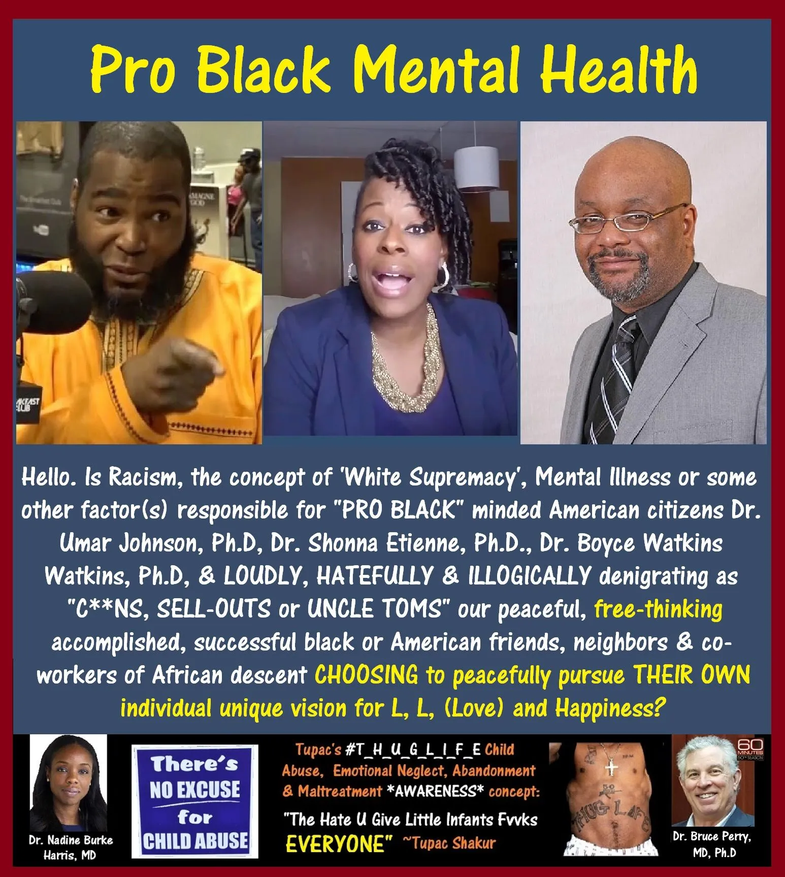 The answer is, many Pro Black minded are protecting their so-called "Queens" from being criticized for creating and perpetuating America's current *CHILD CARE* PUBLIC HEALTH CRISIS, aka America's potentially life scarring SYSTEMIC & GENERATIONAL Culture of Black or African American Child Abuse, Emotional Neglect and Maltreatment that evolved from America's multi-generational, ignorant, once legal Culture of Racism!
