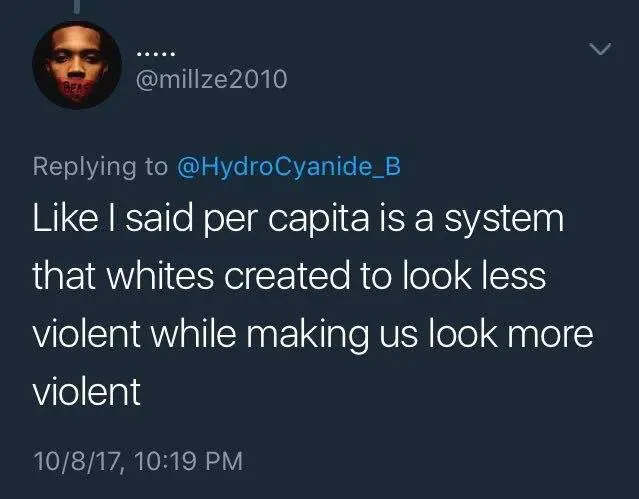 When one group is 10 and the other group is 100 and both commit crimes at 10% which places one at 1 crime and the other at 10 crimes and you say the 10 crimes by the 100 is more important than the `1 crime by the 10. Nonsense.First off what's your definition of violence?Are some "racial" groups more violent?