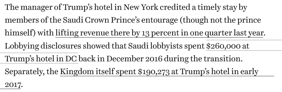 My God you are stupid! Did they receive services from the hotel in exchange for their money? That is not a ******* contribution! Have you been checked by the VA for an undisclosed TBI?Saudi did. It was laundered through trump's hotels.
