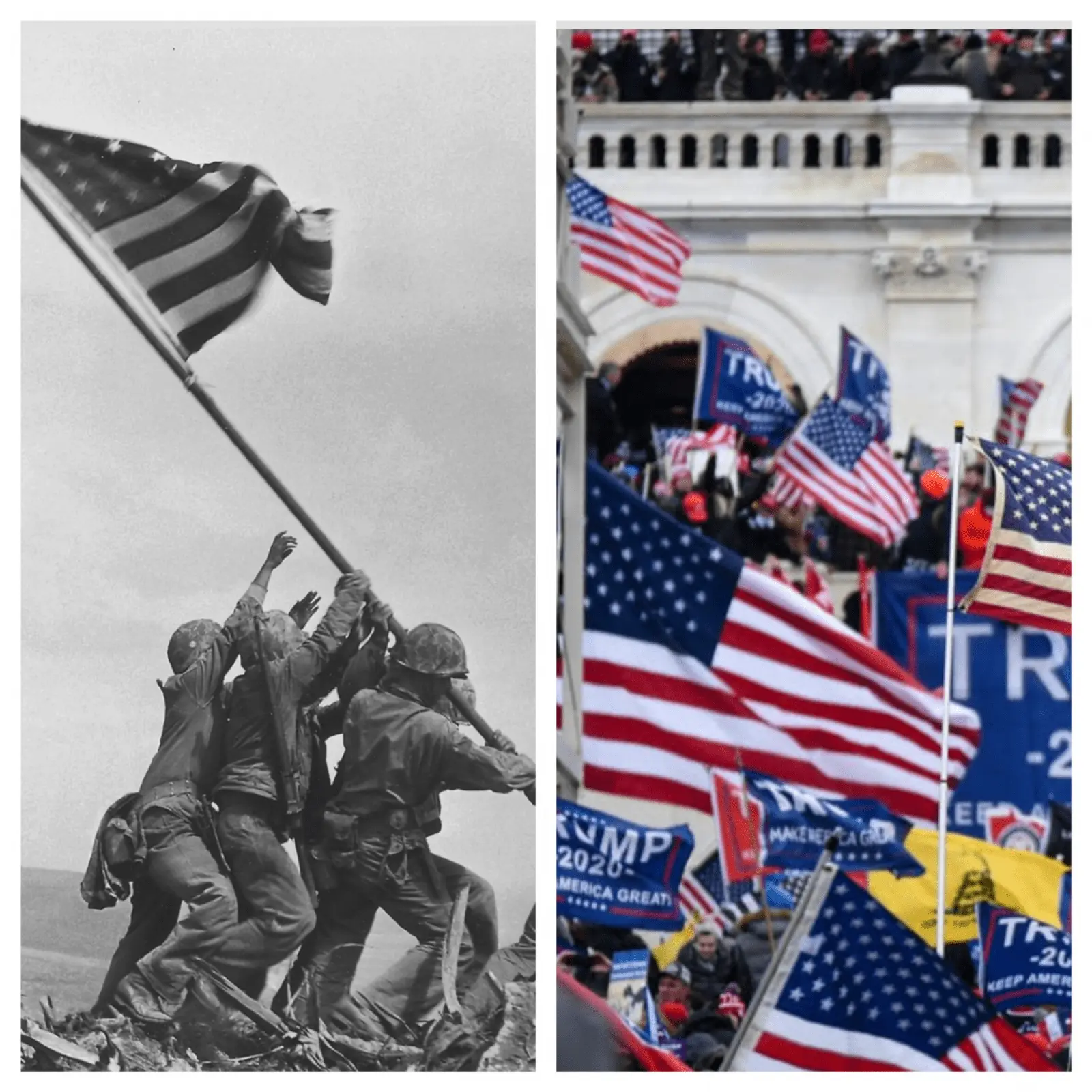 Wow! Generations of Americans have honored the Flag in spite of FDR's illegal order that justified incarcerating American citizens without due process. Americans watched about 6,000 Marines die in a month to take a smelly island that could have been bypassed but the raising of the Flag on Iwo Jima became the symbol of America at the time. We had relative peace and prosperity during Trump's four years but the radicals who have taken over our great democracy now view Old Glory as a symbol of oppression. Get ready for some bad shit in the next couple of years.