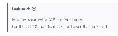From your link:And I gave you links that showed inflation in September had dropped to 2.4% for the preceding 12 months (down from 2.6% the month prior showing that September itself was 2.1%