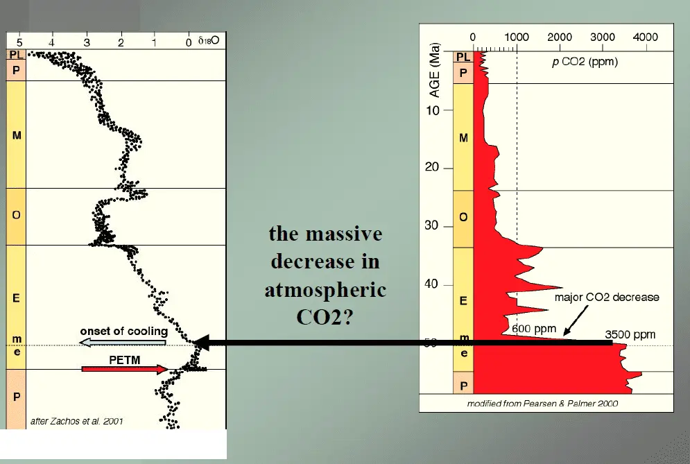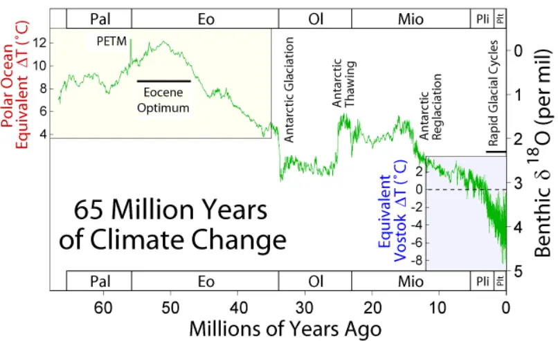 Here's a couple of handy graphs which tell the whole story. The first graph is of the oxygen isotope curve which is widely established for the Cenozoic and widely accepted within the scientific community as a proxy for past climates and temperatures. You can get this from any number of sources and it will show the same thing. I got this one from wiki.