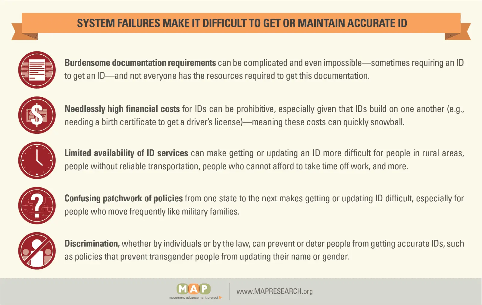 Identity documents typically build upon each other. If a person lacks their birth certificate, for instance, it is harder to get a driver’s license. If they lack a driver’s license, it is harder to prove their identity to get an official copy of their birth certificate. These circular challenges and other barriers—including burdensome documentation requirements, prohibitive financial costs, limited availability of ID services, a confusing patchwork of policies, and discrimination—make it all the more difficult to acquire an ID.