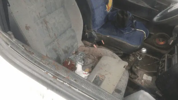 Here is the pic, I rotated it, Isn't the drivers side the one with blue cover. Yuck who could drive around in a car like that?