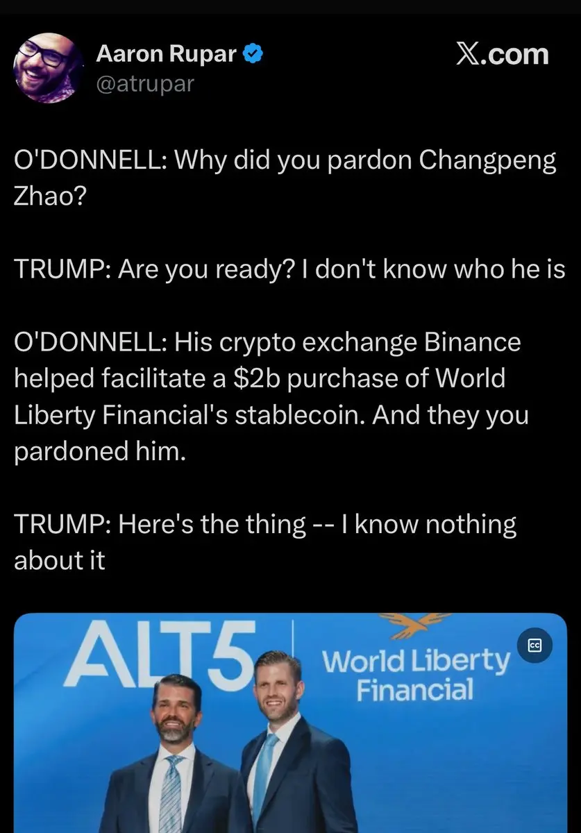 Personally, I think Don is feigning ignorance about CZ because he doesn't want to answer uncomfortable questions about his connection to the guy. He's choosing to look like a doddering old man rather than a corrupt autocrat. The irony being he's both.