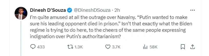 One must ask, with the death of Navalny who was imprisoned for being a political opponent of his country's leader; doesn't that make Navalny like Trump, who is also being attacked by his political opponent? And wouldn't that also mean that Biden in this case, is this country's Putin? I believe Dinesh D'Souza makes a brilliant point here.