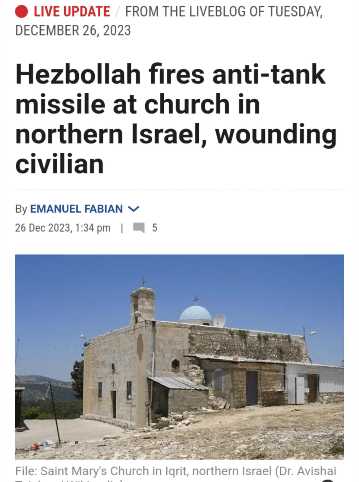 Hezbollah fires anti-tank missile at church in northern Israel, wounding civilian.