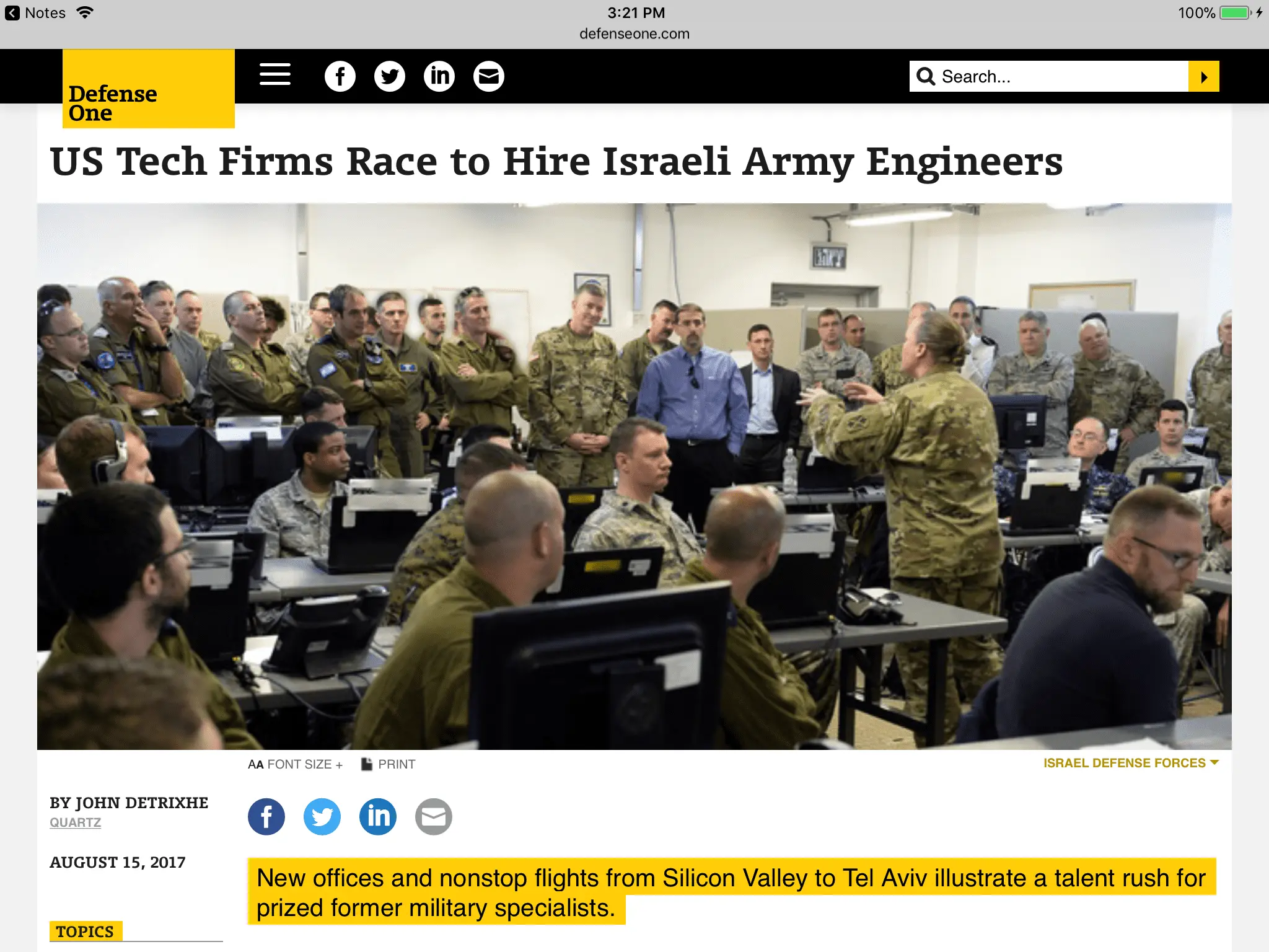 J JoelT1 Senior Member Joined Sep 30, 2017 Messages 1,999 Reaction score 81 Points 50 Nov 17, 2017 #1,139 US Tech Firms Race to Hire Israeli Army Engineers Last edited: Nov 17, 2017